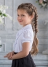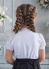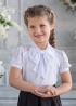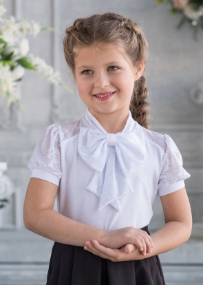 Восхитительная трикотажная блузка для девочек. Выполнена из двух компаньонов: трикотажа и гипюра. Модель с короткими рукавами-фонариками. На груди декор в виде обьемного банта, что добавляет модели элегантности.