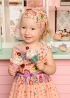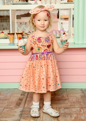 Летнее платье из 100%-ого хлопка для малышек. Модель с круглым вырезом горловины, без рукавов и удобной застёжкой сзади на пуговицы. На талии платье украшено миниатюрным бантиком и регулируется поясом. Свободный крой юбки обеспечивает комфорт и дарит свободу, не стесняя движений. Веселый принт "пироженки" изумительно контрастирует на цветном фоне и дарит отличное настроение. Дополнительно в комплекте идет повязка-бант, которую можно носить еще как бандану. Юбочка на подкладе.