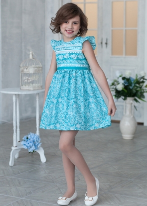 Легкое, почти воздушное платье из натурального 100%-ого хлопка для маленьких модниц. Модель с рукавами-крылышками, застежкой-молнией на спинке и поясом, который завязывается сзади в бант, необычное сочетание "огурцов" на юбке и горизонтальных узоров по лифу делают модель интересной и стильной. Платье на подкладе. Идеальный наряд для жарких летних дней - невероятно легкий и удобный!