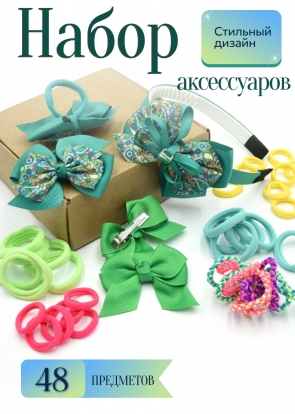 В комплект входят резиночки, ободок, зажимы выполненные в фирменной стилистике, с характерным зеленовато-желтым орнаментом, который придает изысканность и красоту. Такой набор станет отличным подарком для девочек от 3 до12 лет в день рождения, на утреннике в школе или детском саду, добавляя яркий акцент к нарядной одежде, помогая завершить образ украсив голову стильной и запоминающийся прической.